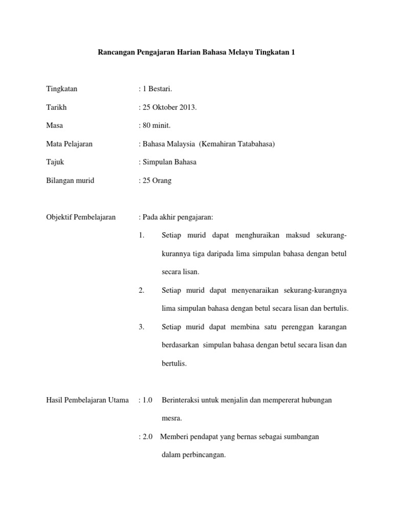 Rancangan Pengajaran Harian Bahasa Melayu Tingkatan 1
