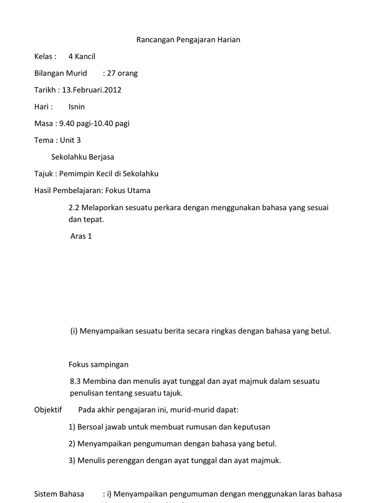 Rancangan Pengajaran Harian Kssr Bahasa Melayu Tahun 3