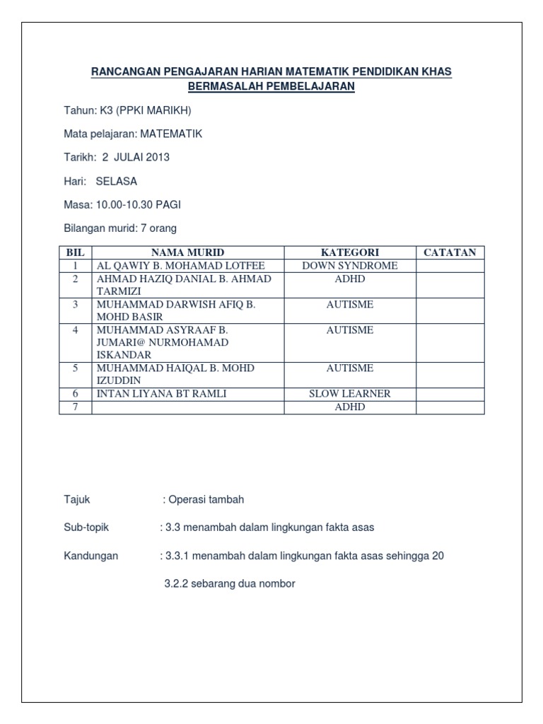 Rancangan Pengajaran Harian Matematik Untuk Program Pendidikan Khas Bermasalah Pembelajaran