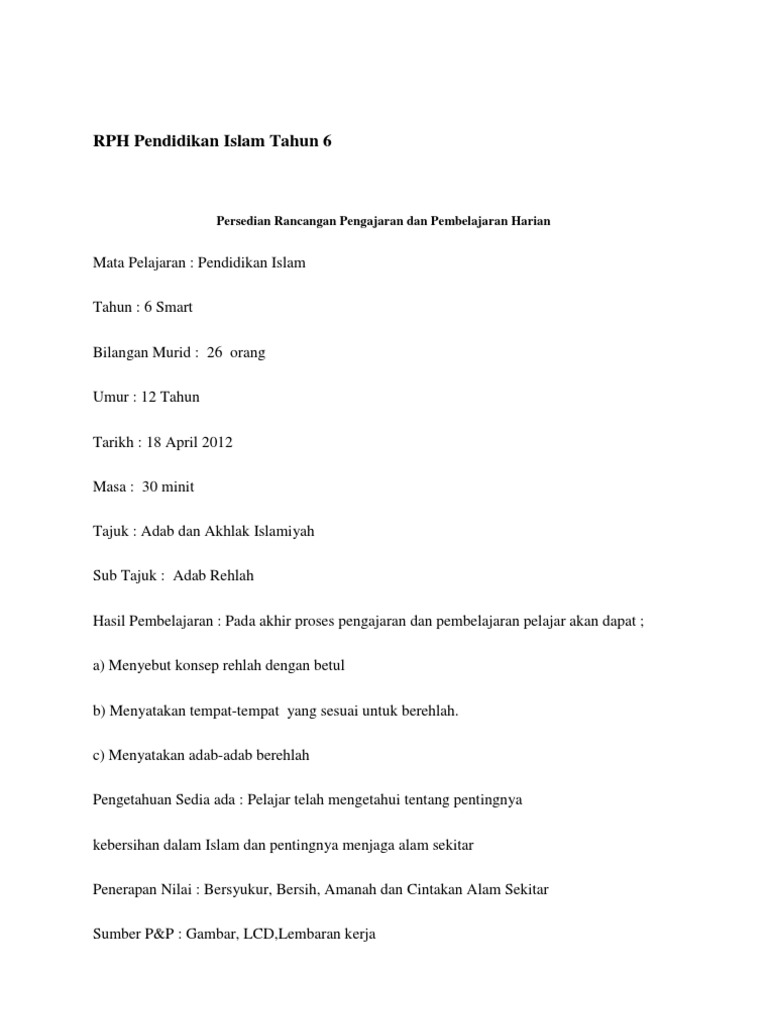Unit Pendidikan Islam Pejabat Pendidikan Daerah Ranau Rancangan Pelajaran Harian Rph Mp Pendidikan Islam Ranau 2018