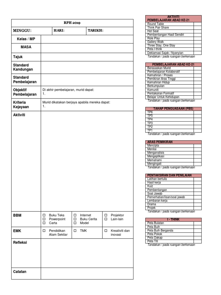 Templat Rancangan Pengajaran Harian Rph Pembelajaran Abad Ke 21 Pak 21