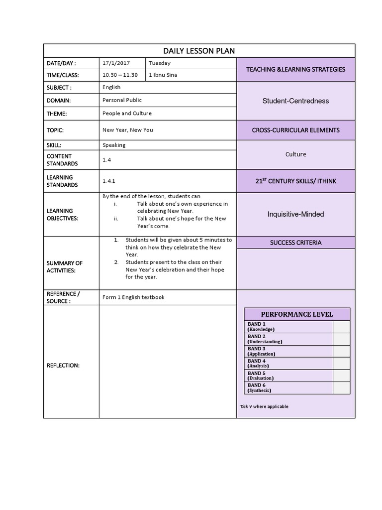 Cefr Alligned Lesson Plan Template For Form 2 Ppdpp Lesson Plan Educational Psychology