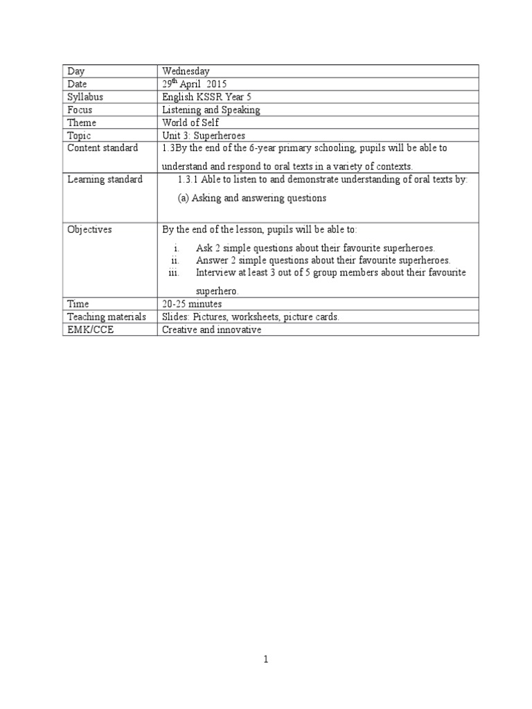 Lesson Plan Standard 5 Unit Superhero Listening And Speaking Question Lesson Plan