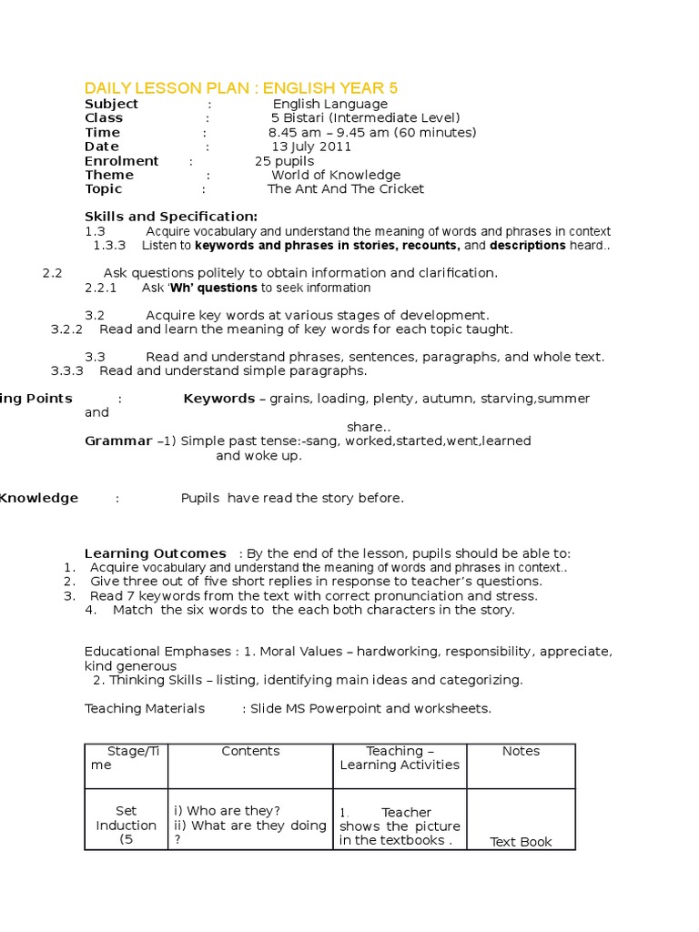 Lesson Plan Bahasa Inggeris Tahun 5