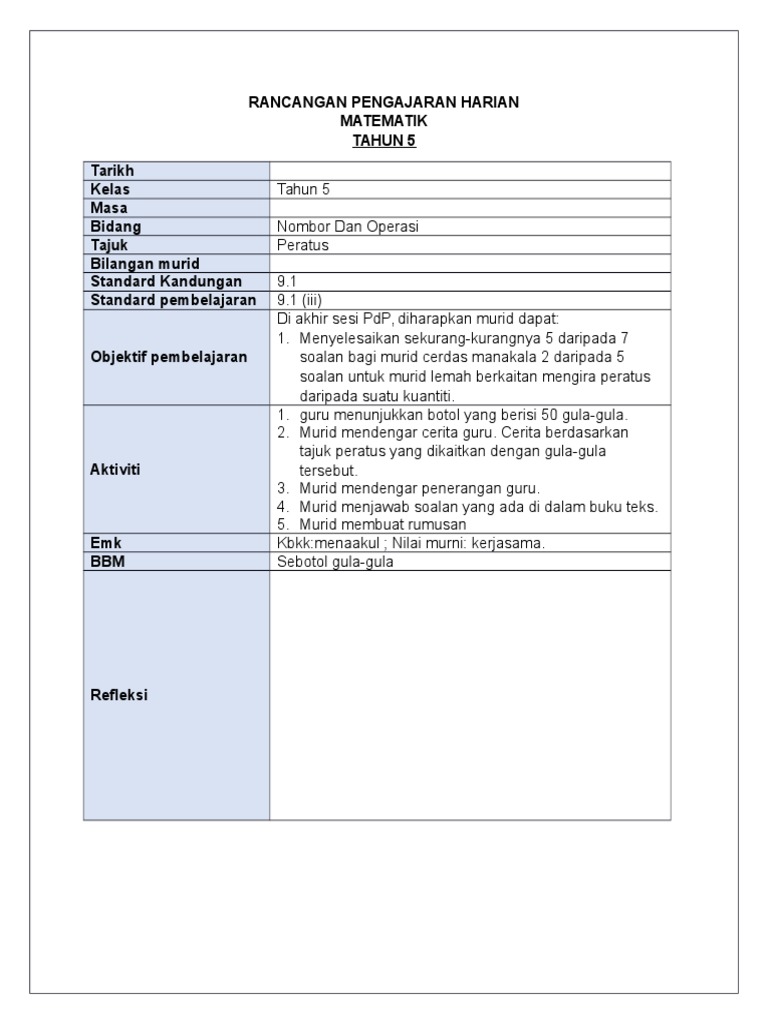 Rancangan Pengajaran Harian Matematik Tahun 4 Peratus