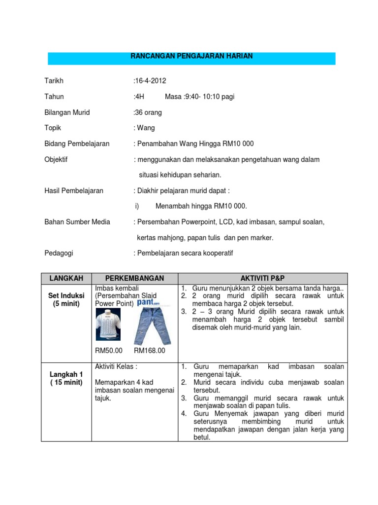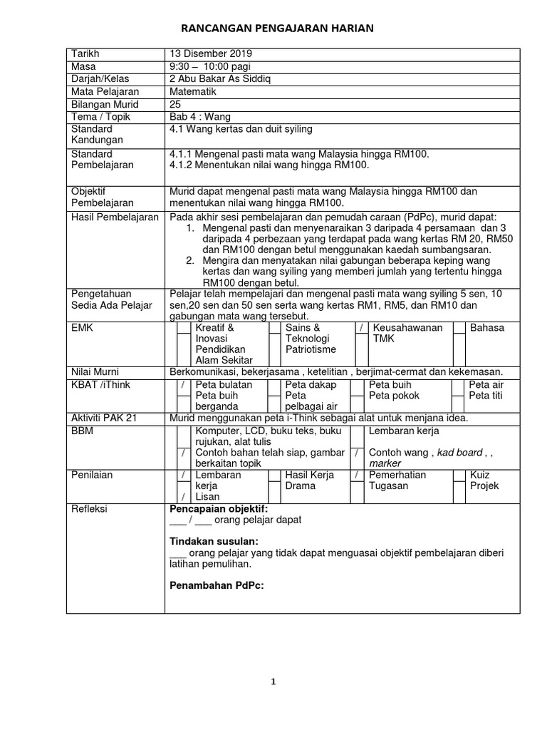 Rancangan Pengajaran Harian Matematik Tahun 6 Tarikh Kelas Masa Bidang Wang Course Hero