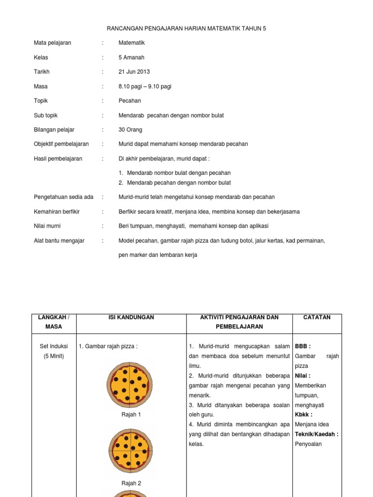 Rancangan Pengajaran Harian Matematik Tahun 5 Pecahan Latest Docx Document