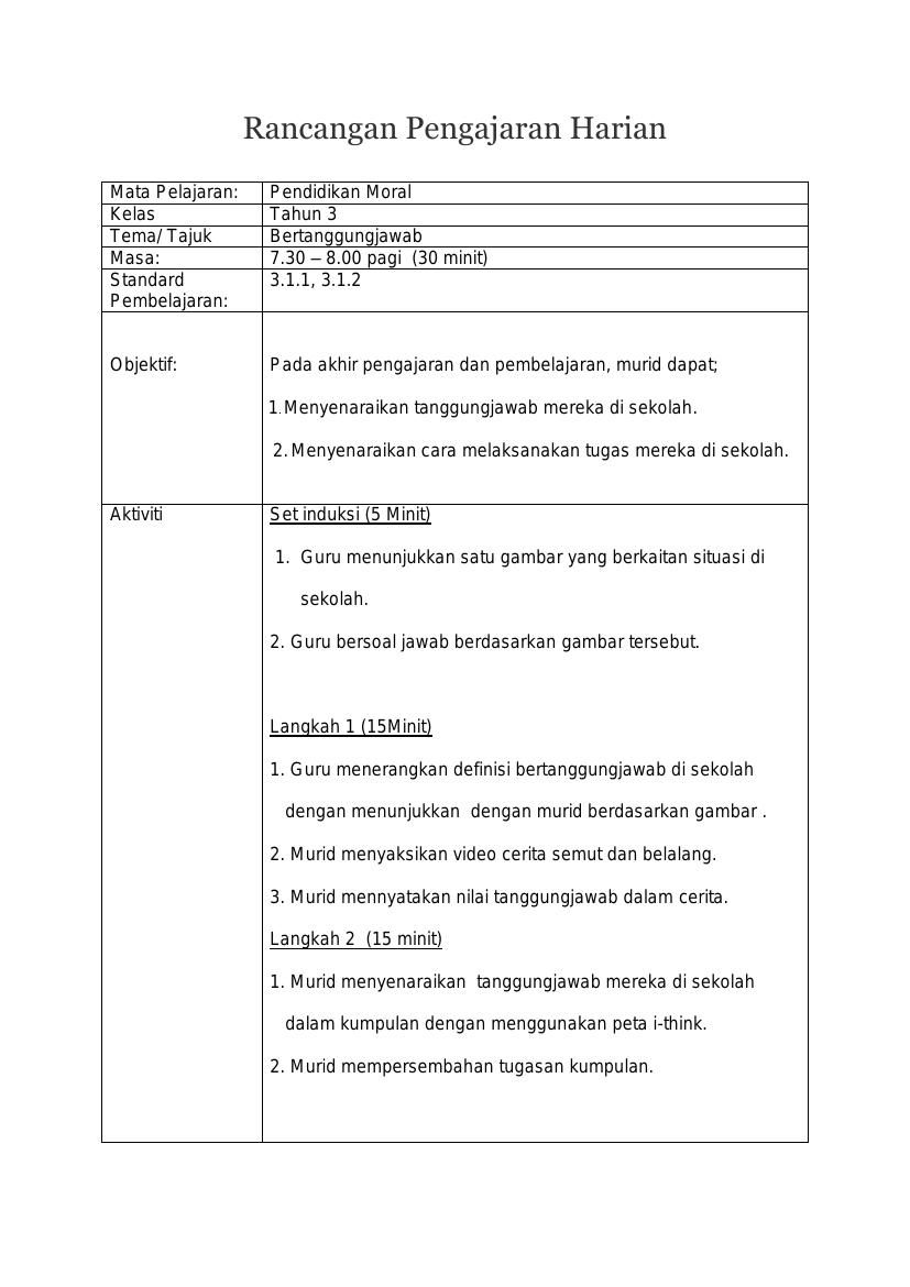 Rancangan Pengajaran Harian Pendidikan Moral Tahun 3 Kssr