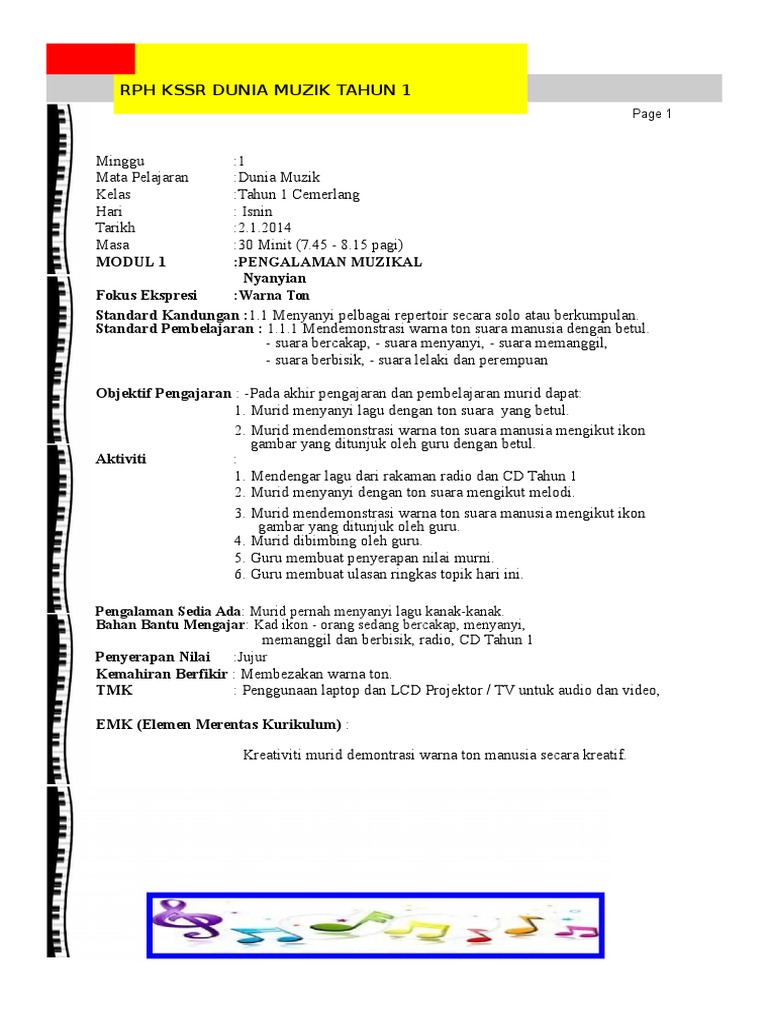 Rph Tahun 1 Kssr Rancangan Mengajar Tahun 1 Dunia Muzik