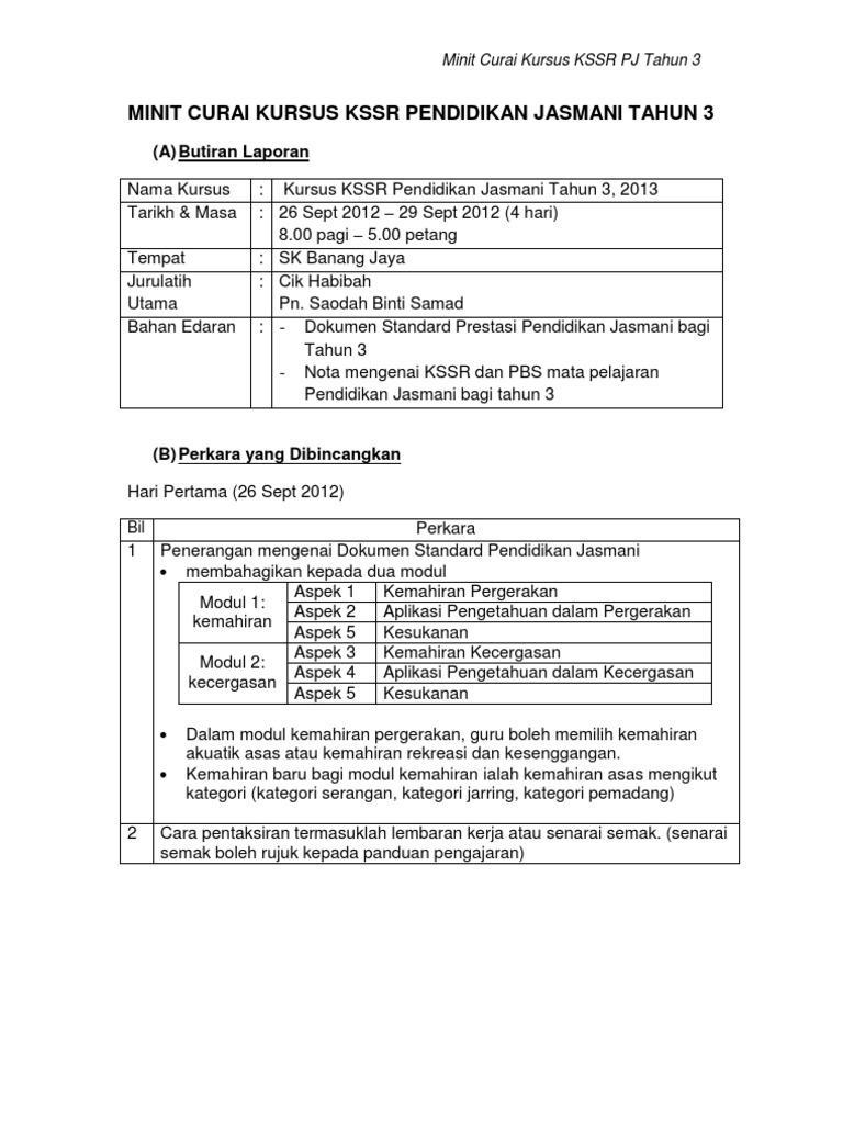 Minit Curai Kursus Kssr Pendidikan Jasmani Tahun 3