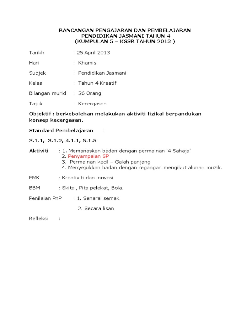 Rph Pendidikan Jasmani Tahun 4 Semakan 2020