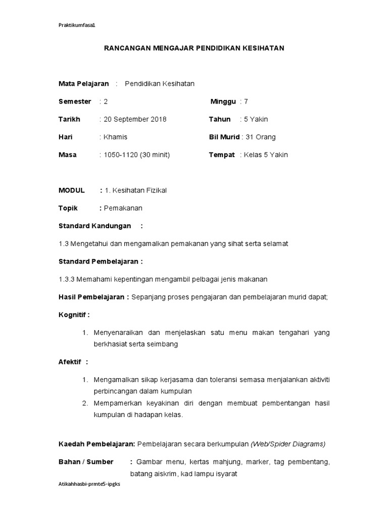 Rancangan Pengajaran Harian Pendidikan Kesihatan