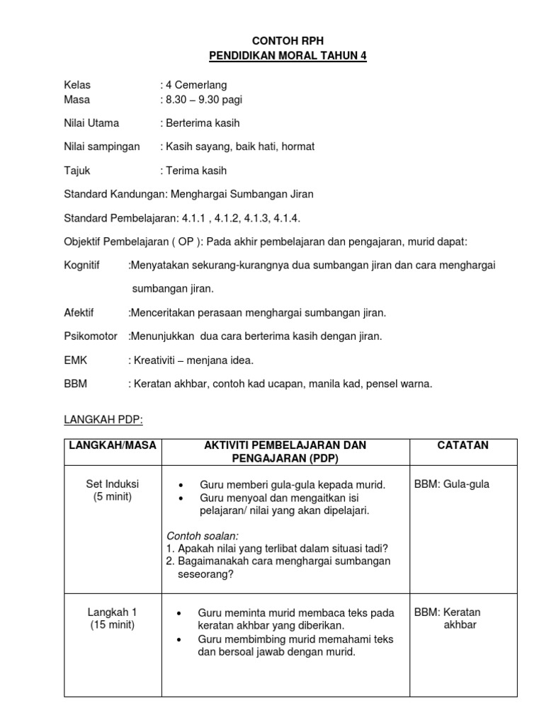 Contoh Penulisan Rph Pendidikan Moral Tahun 4 Kssr Cuitan Dokter