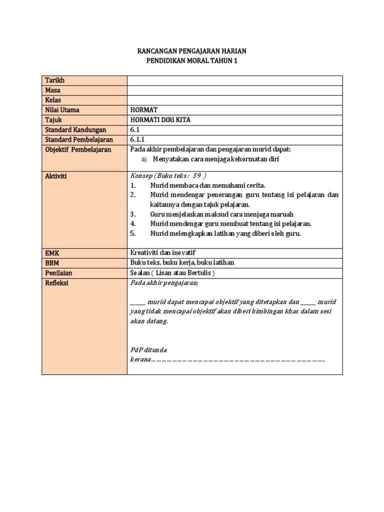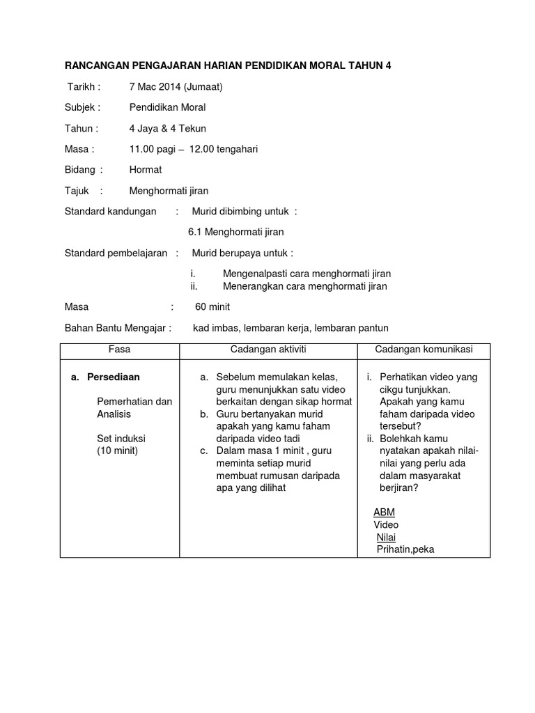 Contoh Rph Pendidikan Moral Tahun 4 Kssr