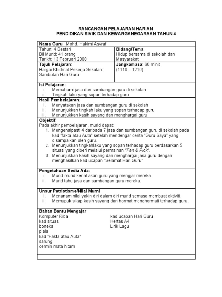 Doc Tahun 4 Rancangan Pengajaran Harian Pendidikan Sivik Dan Kewarganegaraan Zaahara Mahlidi Academia Edu
