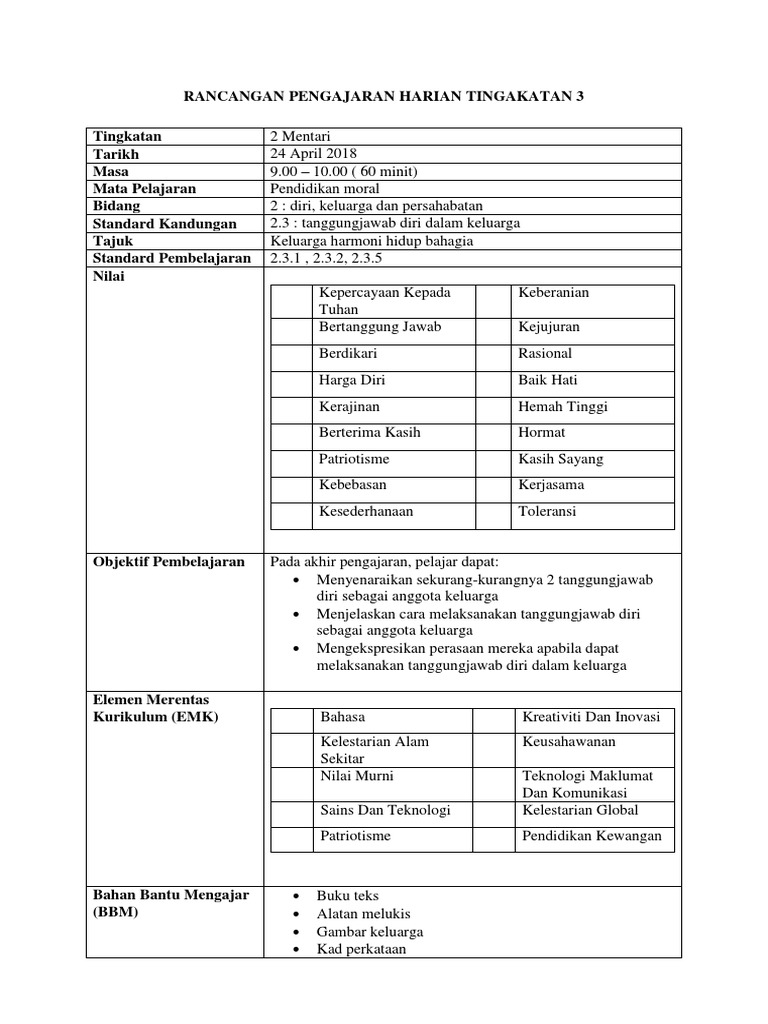 Contoh Rancangan Pengajaran Harian Pendidikan Moral Kssm
