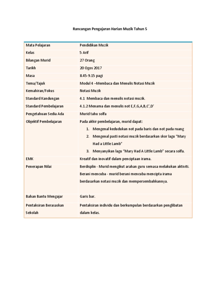 Contoh Rph Muzik Tahun 4 2018