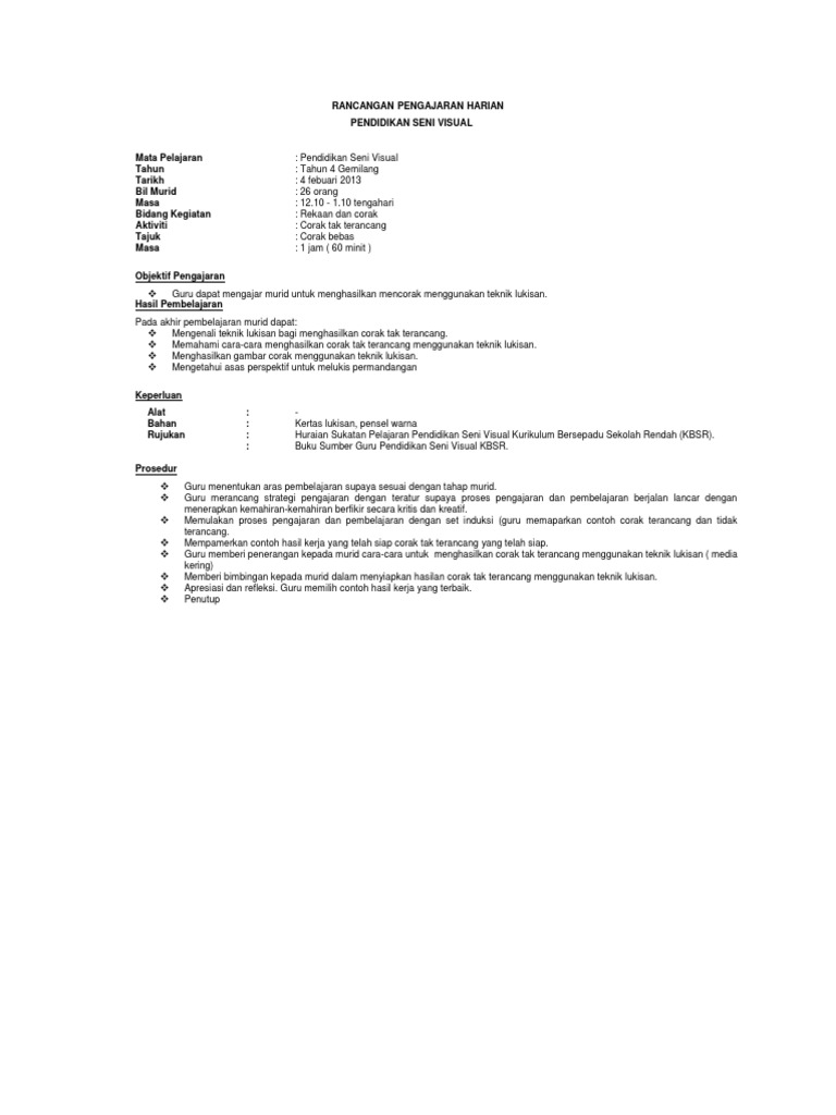 Doc Rancangan Pengajaran Harian Pendidikan Seni Visual Bil Perkara Dyana Nonong Academia Edu