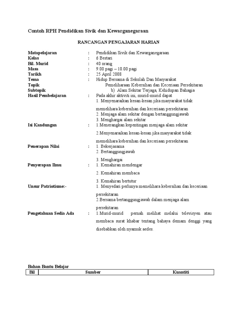 Contoh Rph Pendidikan Sivik Dan Kewarganegaraan