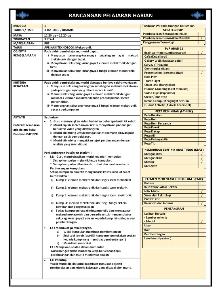 Templat Rancangan Pengajaran Harian Rph Pembelajaran Abad Ke 21 Pak 21