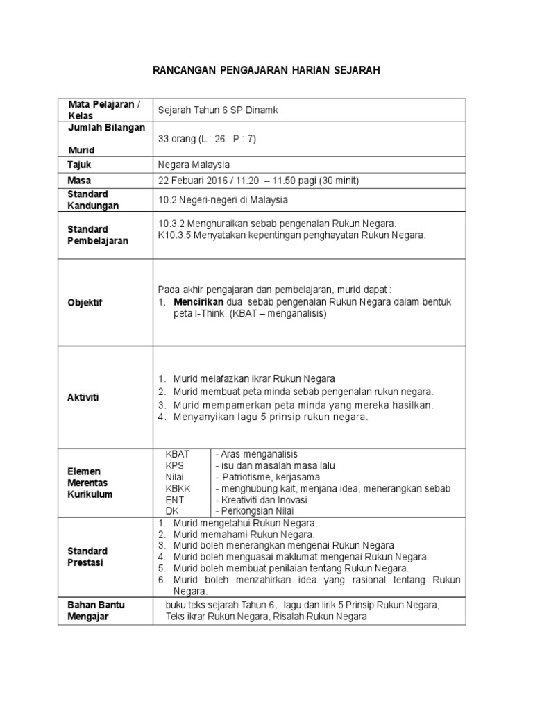 Rancangan Pengajaran Harian Sejarah Tahun 6