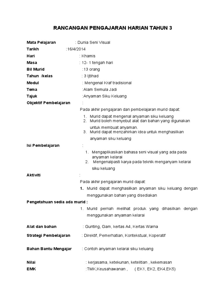 Psv Rancangan Pengajaran Harian Kssr Seni Tahun 4