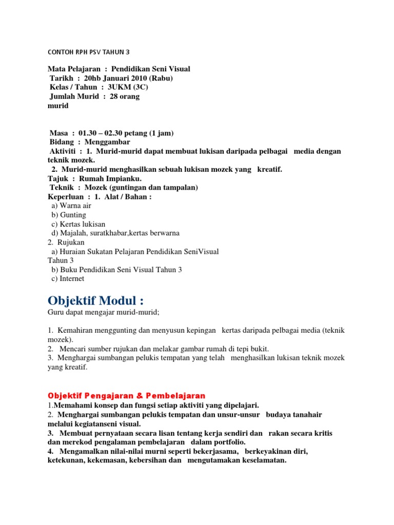 Rph Pendidikan Seni Visual Psv Tahun 3 Kssr Rancangan Mengajar Harian