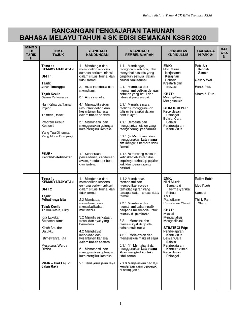 Rpt 2020 Bahasa Melayu Tahun 4 Kssr Semakan Mengikut Tajuk Docx Rancangan Pengajaran Tahunan 2020 Minggu Minggu 1 1 Januari U2013 5 Januari 2020 Minggu Course Hero