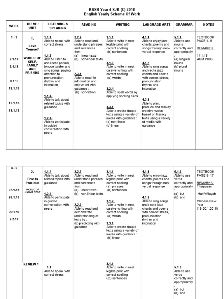 Year 1 2 3 4 Simplified Scheme Of Work For Sekolah Kebangsaan Teacherfiera Com