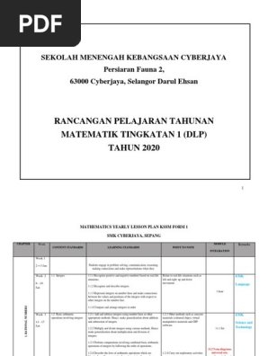Rpt Matematik T1 2020 Baru Dlp Docx Page 1 Of 14 Smk Cochrane Yearly Lesson Plan 2020 Mathematics Form 1 Week Week 1 1 January U2013 5 January 2020 Course Hero