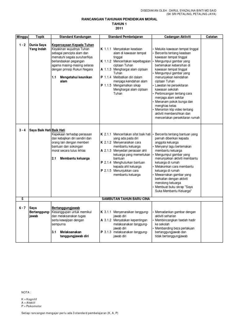 Rancangan Tahunan Pendidikan Moral Tahun 1 2011