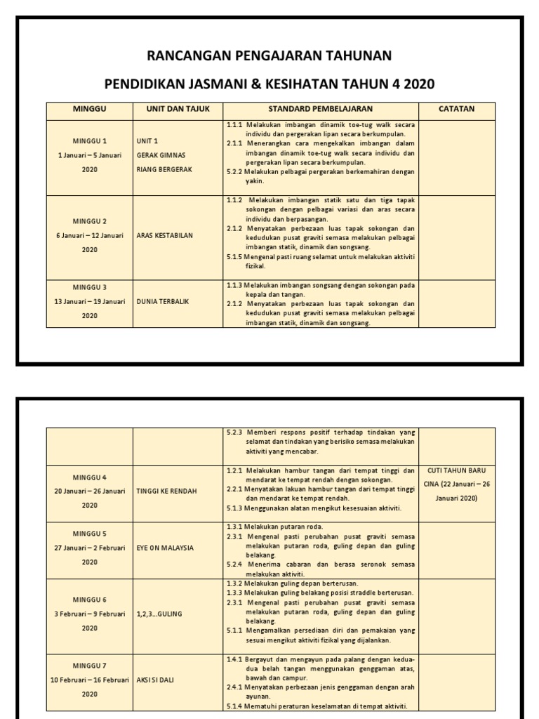 Rpt Pendidikan Jasmani Kesihatan Tahun 4 2020 Kssr Semakan Sumber Pendidikan Cute766