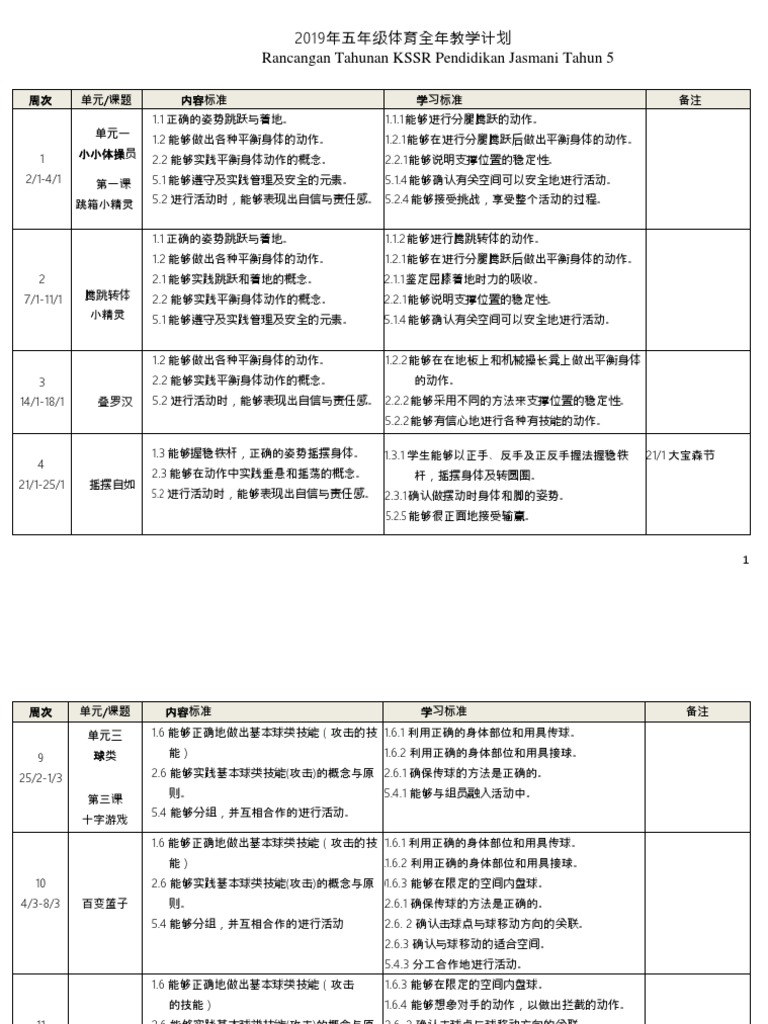 2019年五年级体育全年教学计划rancangan Tahunan Kssr Pendidikan Jasmani Tahun 5