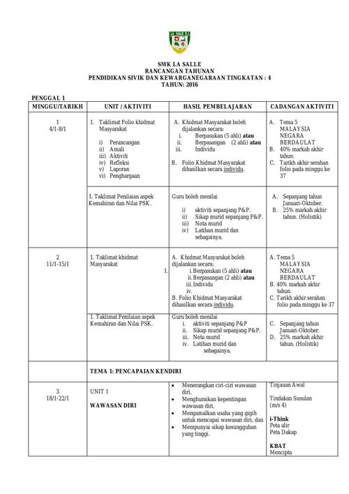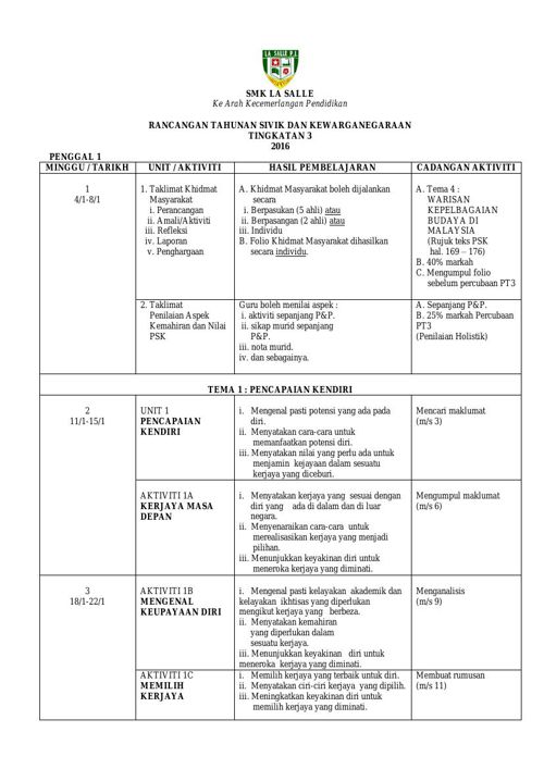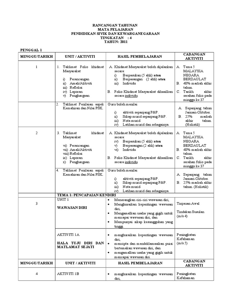 Rancangan Tahunan Pendidikan Sivik Dan Kewarganegaraan Tingkatan Satu