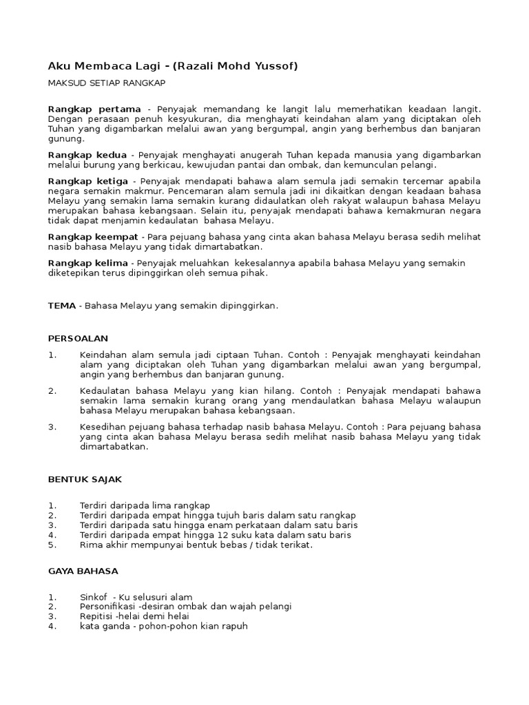 Bahasa Melayu Bahasa Malaysia Pmr Spm Komsas Tingkatan 4 Sajak Aku Membaca Lagi