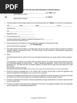 Motor Vehicle Sale Purchase Agreement Sales Securities Finance