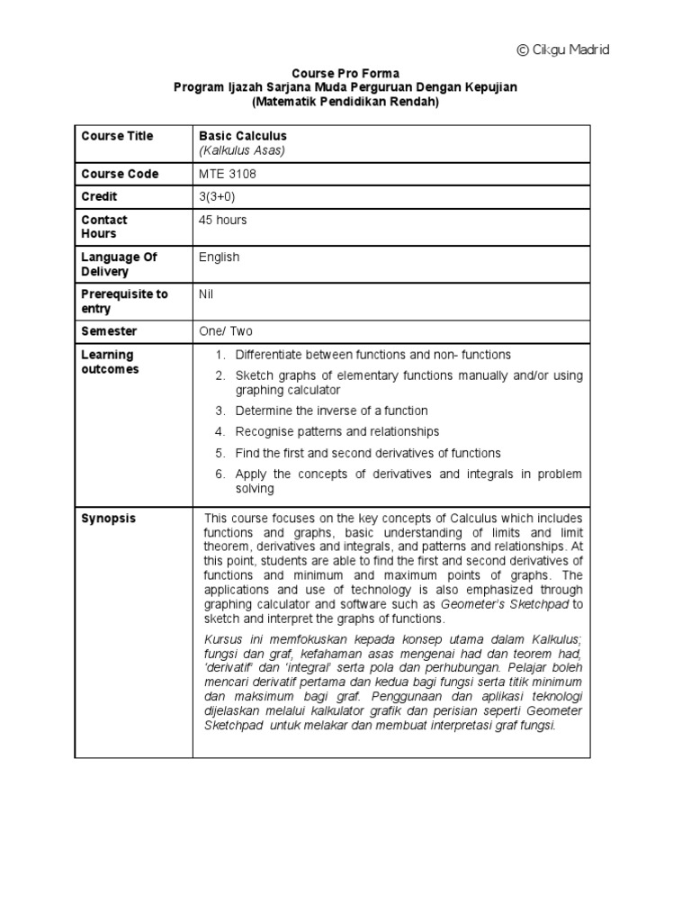 Proforma Mte 3108 Basic Calculus Derivative Integral