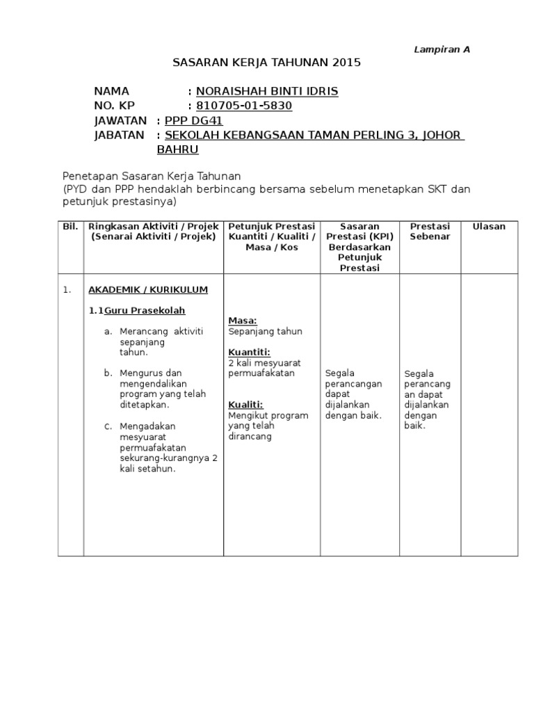 Sasaran Kerja Tahunan Guru Prasekolah Doc Document
