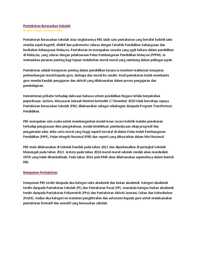Pentaksiran Berasaskan Sekolah Daripada Wikipedia Ensiklopedia Bebas
