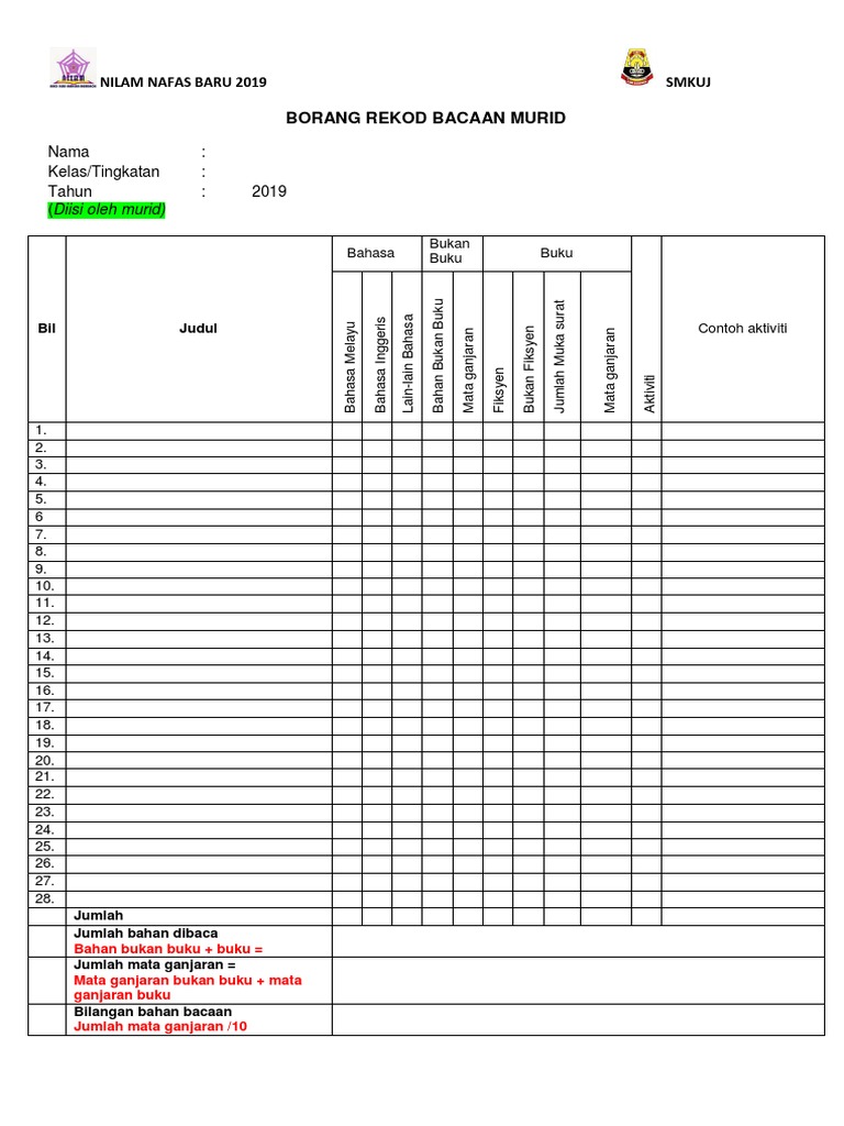 Buku Rekod Bacaan Nilam Sekolah Rendah Sekolah Menengah Cute766