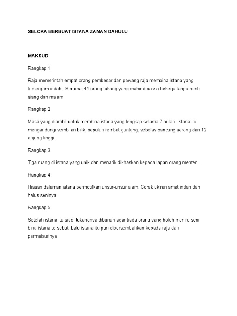 Nota seloka berbuat istana zaman dahulu zaaba tema. Seloka berbuat istana zaman dahulu za ba kebaikan amalan makan bersama sama keluarga. Maksud rangkap 1 raja menitahkan orang besar empat untuk membina istana berkota. Maksud tema persoalan nilai pengajaran sila share kepada kawan kawan dengan menekan butang di bawah maksud tema persoalan nilai murni pengajaran gaya bahasa fokus soalan komsas jawapan soalan peperiksaan skema jawapan contoh soalan jawapan seloka berbuat istana zaman dahulu k1.