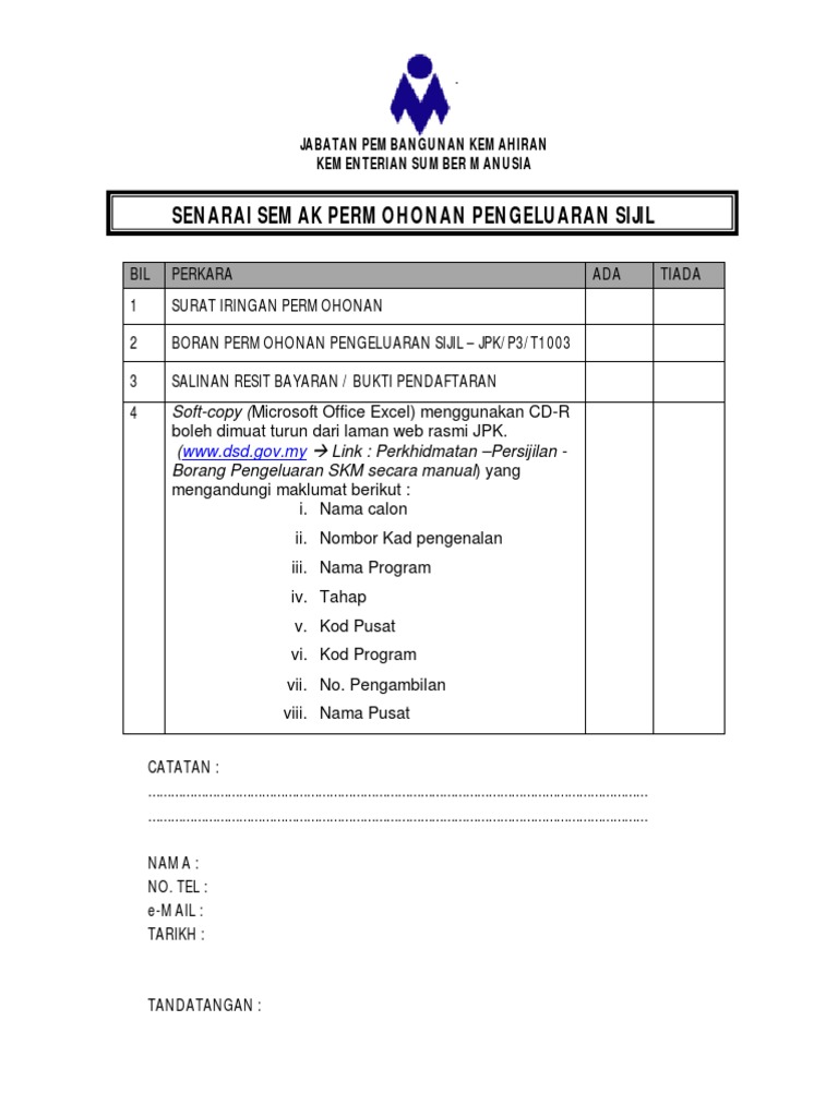 Jabatan Pembangunan Kemahiran Pemakluman Pelaksaaan Sistem Semakan Status Pengeluaran Sijil Kemahiran Malaysia Dan Diploma Kemahiran Malaysia Dkm