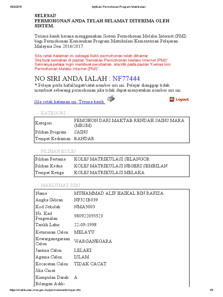 Aplikasi Permohonan Program Matrikulasi Arif Pdf Document