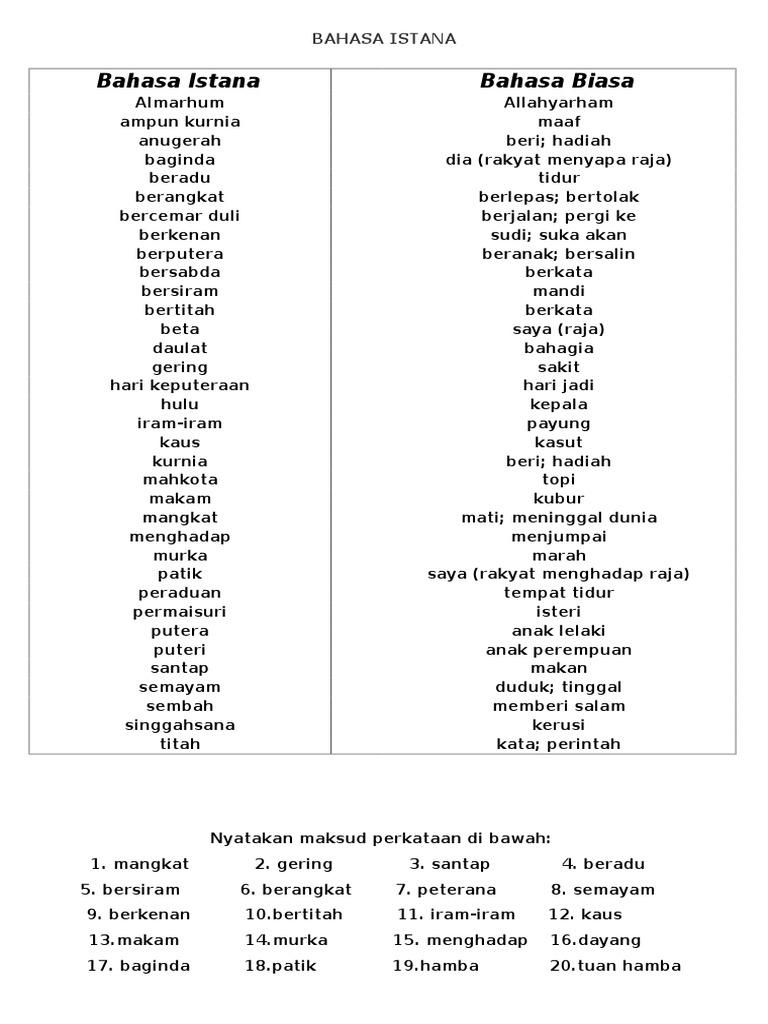 Bahasa Istana Dan Maksudnya
