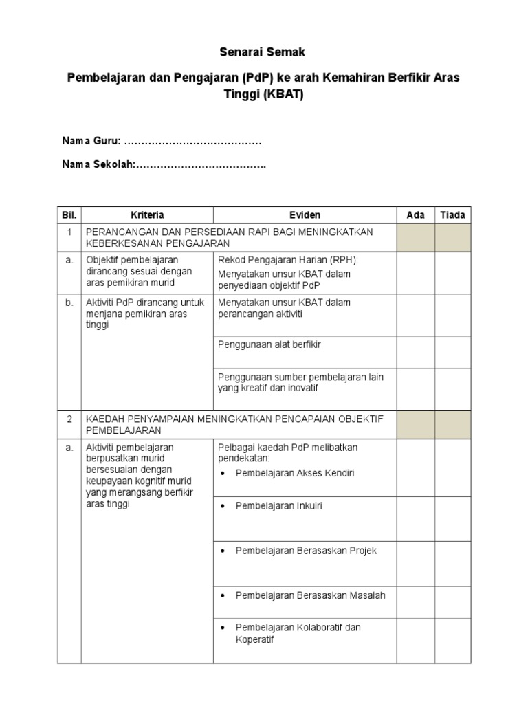 Senarai Semak Pdp Kbat