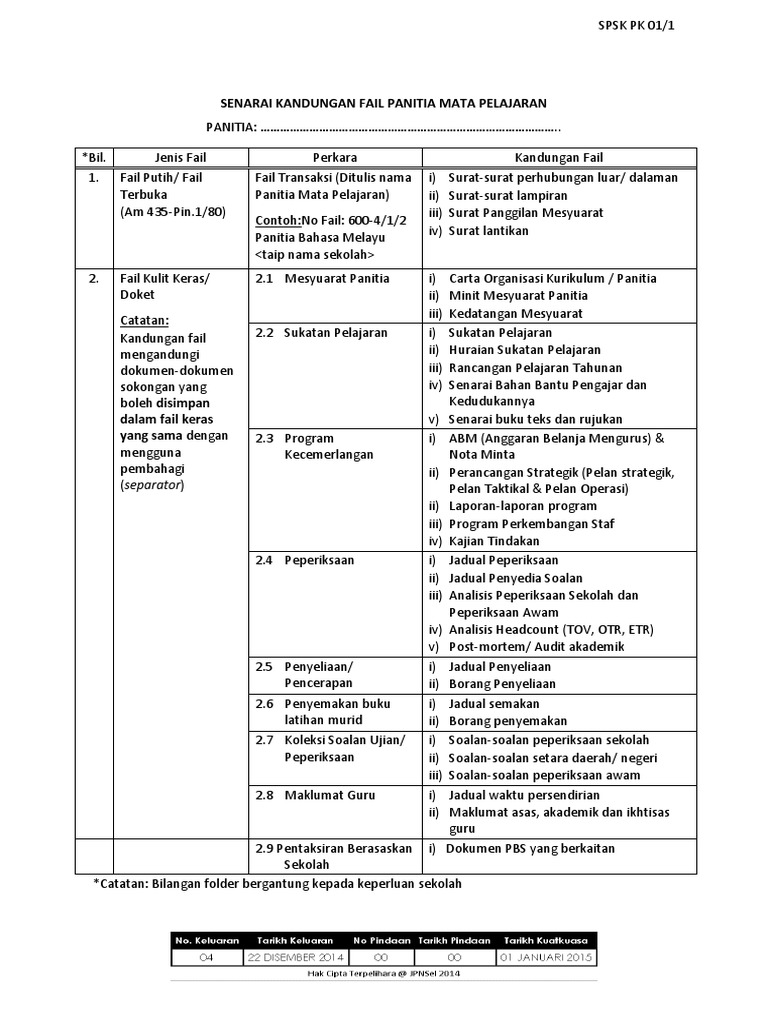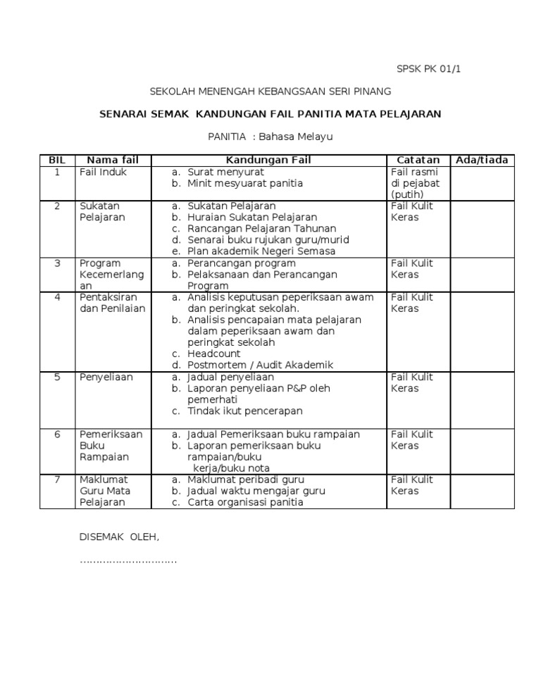 Pk01 1 Senarai Semak Kandungan Fail Panitia