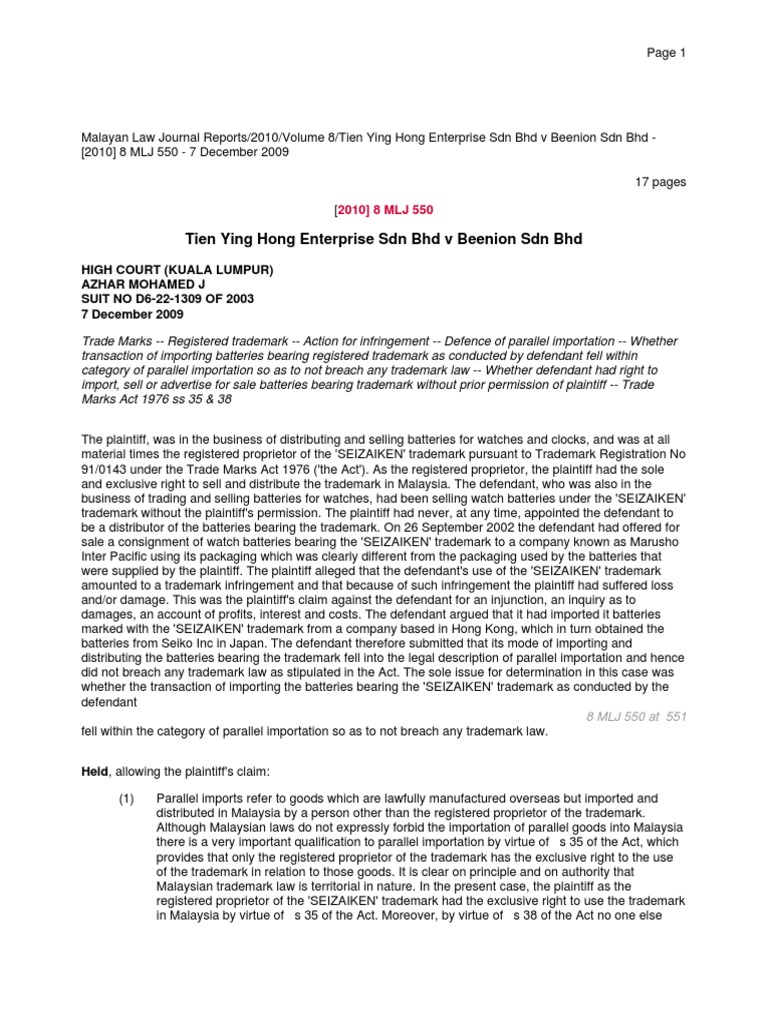 001 Tien Ying Hong Enterprise Sdn Bhd V Beenion Trademark Common Law