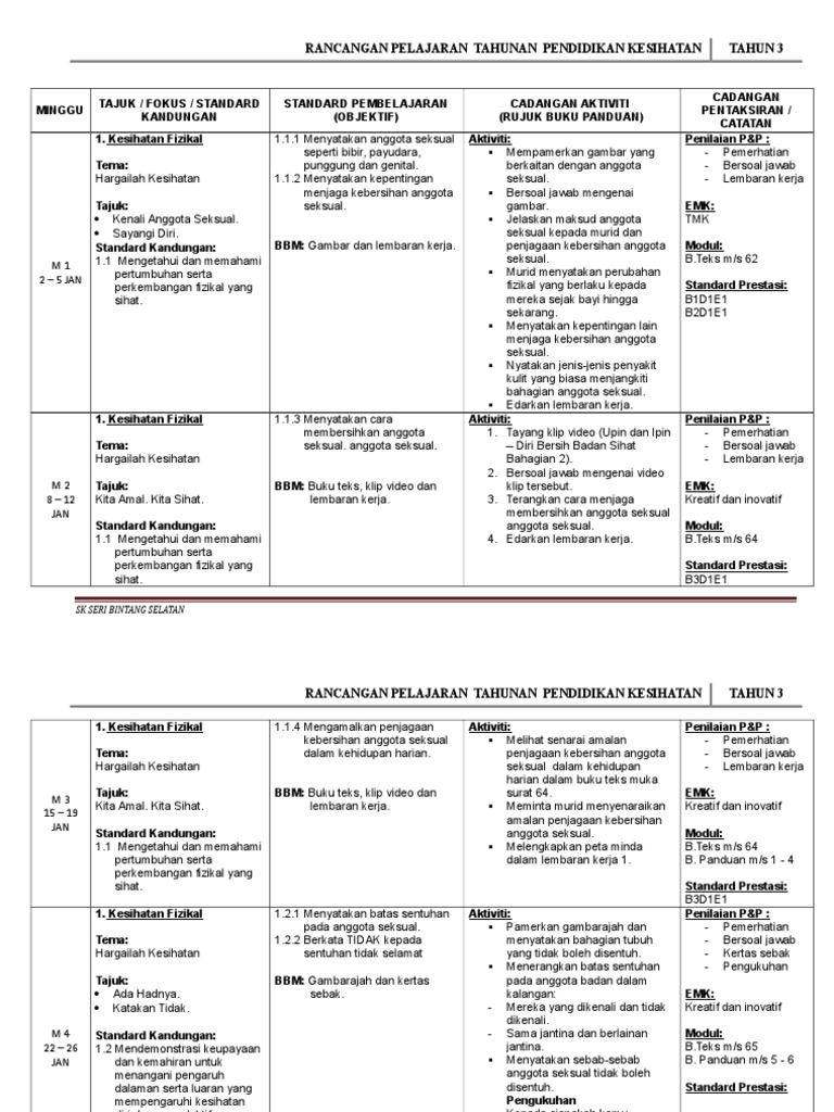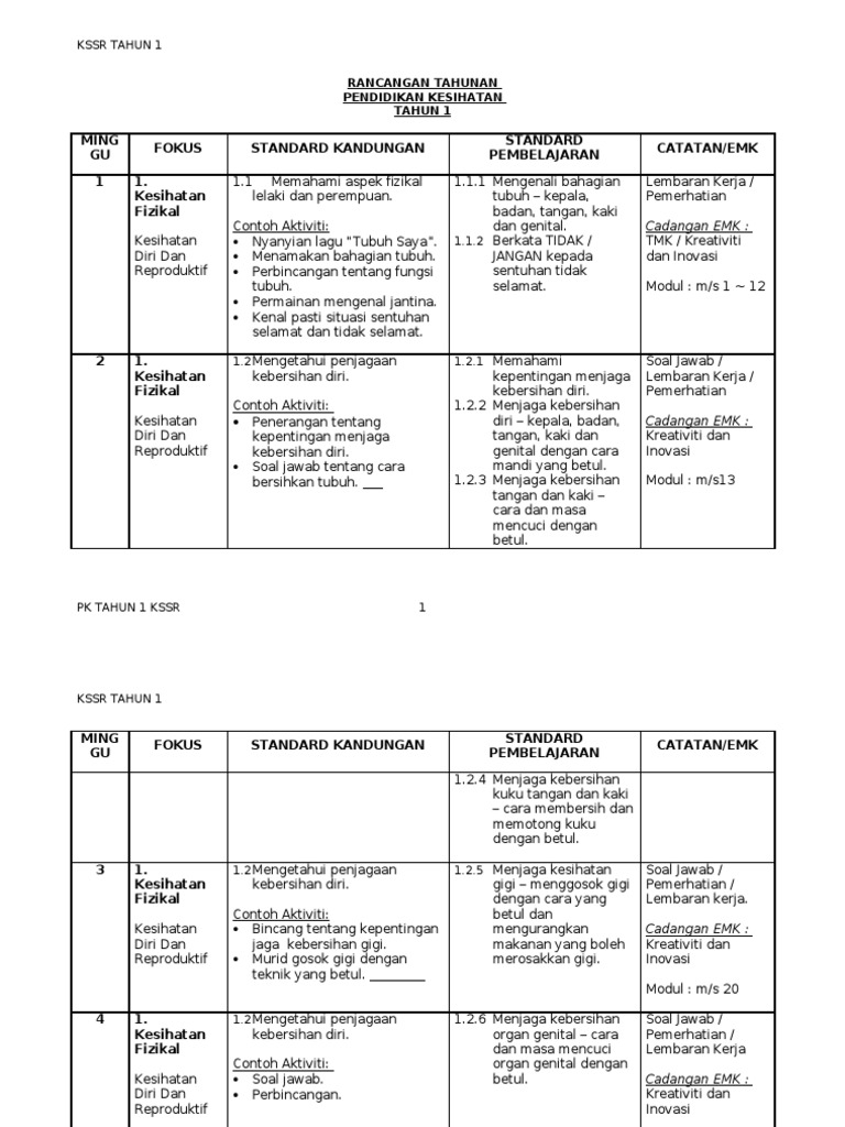 Doc Rpt Tahun 1 Kssr Rpt Pendidikan Kesihatan Sk Tahun 1 Sistem Guru Online Academia Edu