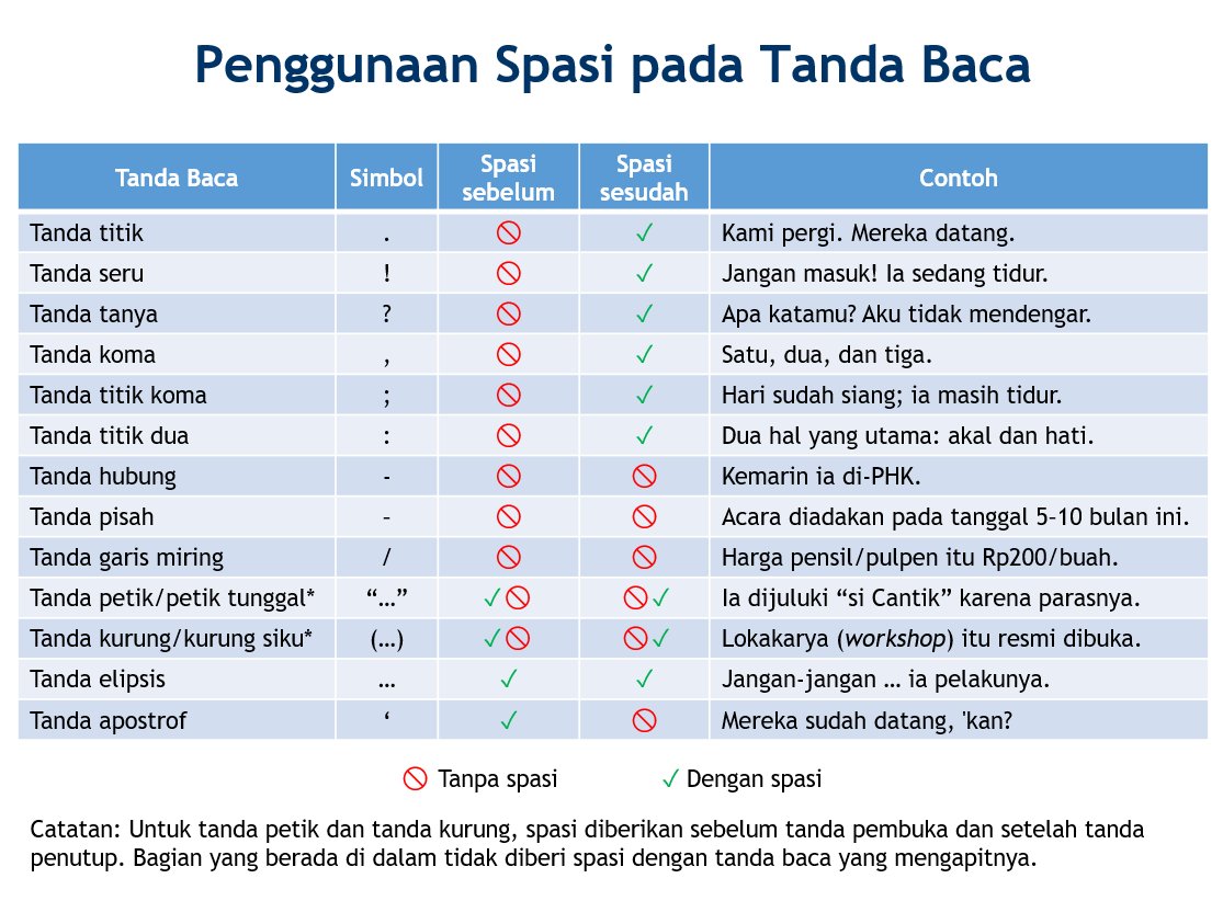 Ivan Lanin A Twitter Hampir Semua Tanda Baca Tidak Perlu Diberi Spasi Sebelumnya Tabel Ini Memberikan Kaidah Dan Contoh Penggunaan Spasi Pada Tanda Baca Https T Co 7d07it28y2