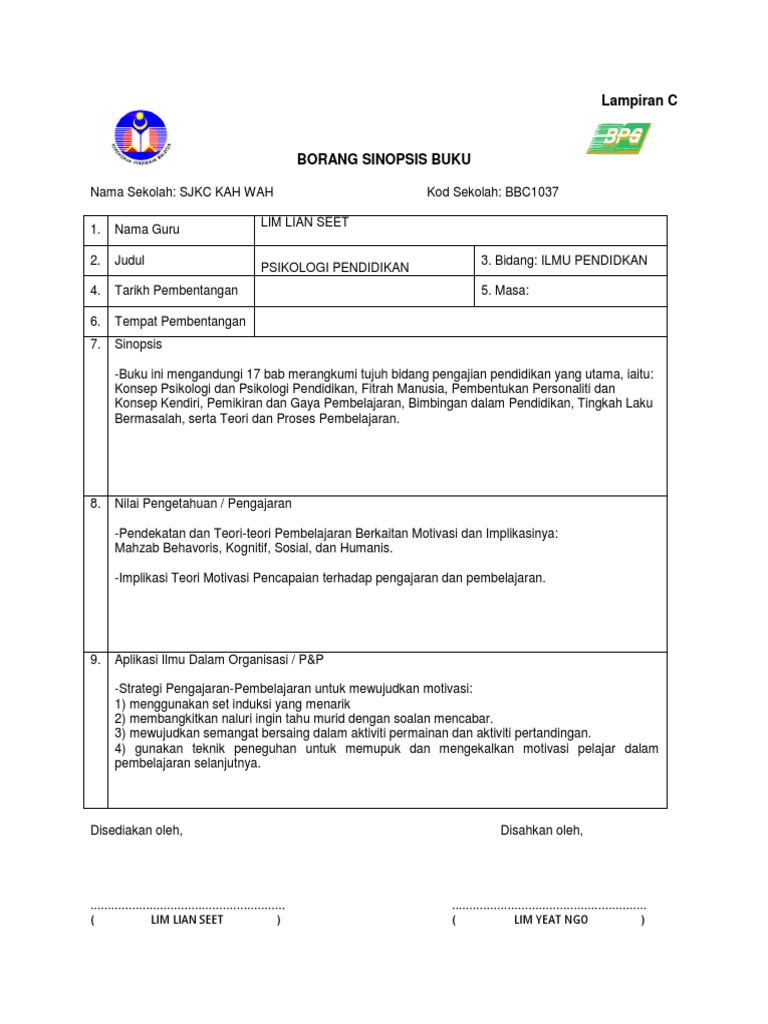 Borang Sinopsis Buku Nama Sekolah Sjkc Pandamaran B Kod Sekolah Bbc0050